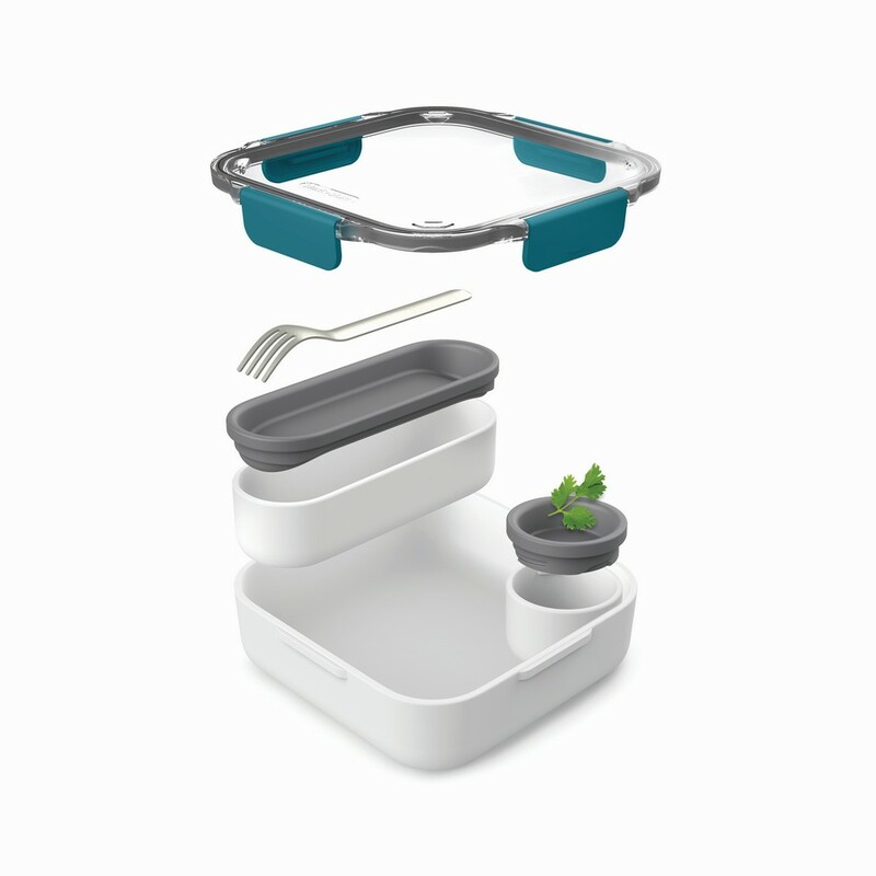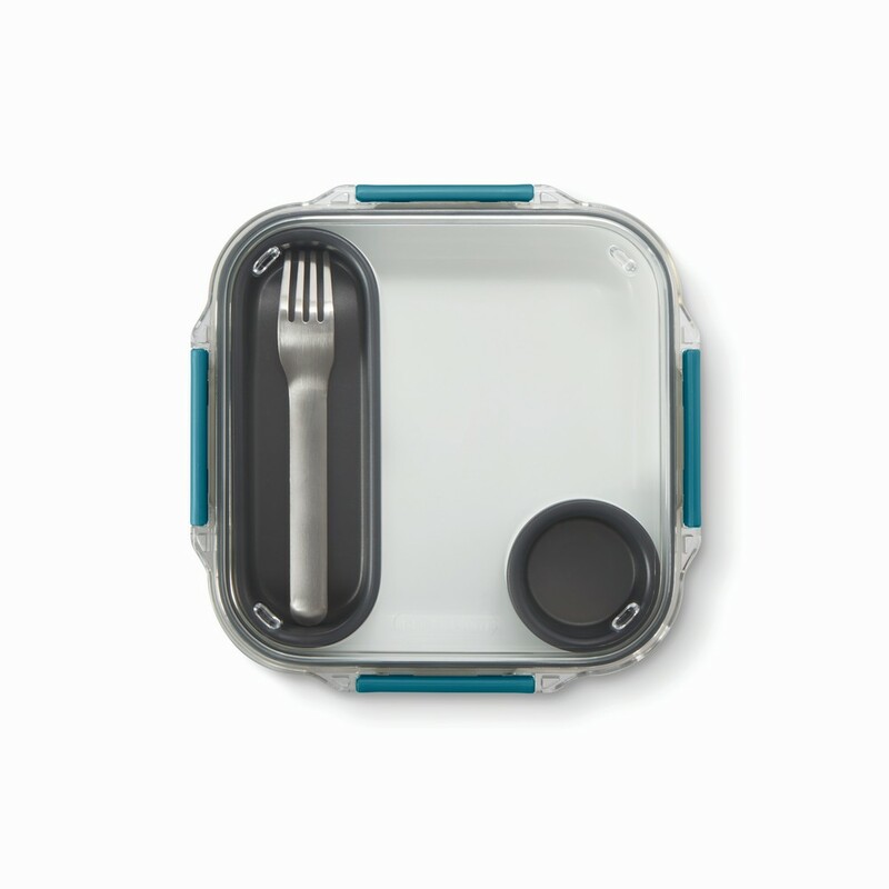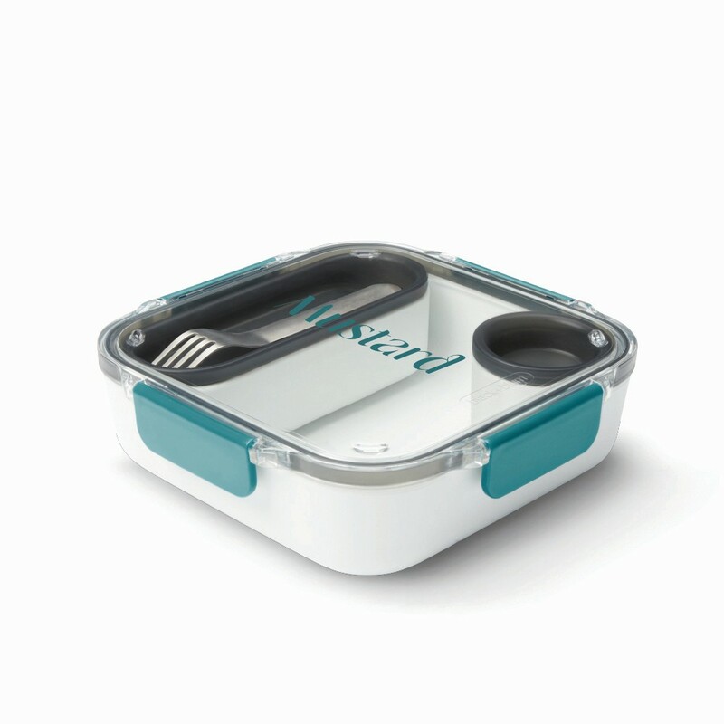 Ten wyjątkowy lunchbox został wyposażony w wygodny wewnętrzny pojemnik oraz dodatkowy pojemnik na sos, umieszczony w pokrywie, co umożliwia oddzielenie składników posiłku, zapewniając ich świeżość i idealny smak. Dodatkowym atutem jest dołączony widelec ze stali nierdzewnej, który z łatwością można przechowywać razem z pudełkiem, utrzymując wszystko w jednym miejscu.